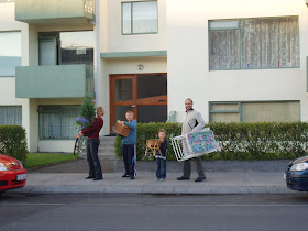 Birte, Matthías, Bjarki og Baldur við flutninga milli Laugalækjar og Laugarnesvegar